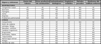 La guía incluye una tabla (reproducida y traducida a continuación) de referencia rápida de síntomas para detectar posibles afectados por el síndrome del edificio enfermo, en general, y otros síntomas aislados (humo del tabaco, por ejemplo) que en conjunto pueden llevar al mismo mal o a otros de distinta envergadura.