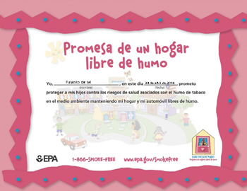 Para luchar contra los males del humo de segunda mano y conseguir un mejor ambiente en los espacios internos, la EPA puso en marcha la Smoke-free Home Pledge Campaign, que le reportó diversos premios de la League of American Communications Professionals. El funcionamiento es simple: en la página web de la campaña se "promete" mantener el hogar libre de humo de tabaco y se recibe un certificado que deberá colgarse a la vista de todos, una serie de recomendaciones y un kit anti-humo: marco de fotos, posavasos, adhesivos...