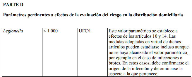 Según datos de la OMS, de entre todos los patógenos presentes en el agua en la UE las legionelas son las que mayor carga sanitaria generan. Una vez que entre en vigor el nuevo texto, el análisis de Legionella se extenderá a todos los sistemas de agua potable de la UE, en el marco de un nuevo análisis de evaluación de riesgos a realizar en los sistemas de distribución domiciliaria de locales (públicos y privados). Esta evaluación de riesgos incluirá por una parte un análisis general de los posibles riesgos vinculados al sistema de distribución y por otra el control de Legionella en aquellos locales en los que se hayan detectado riesgos específicos para la calidad del agua y la salud humana.