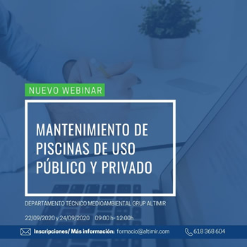 Altimir Grup organiza una nueva edición de la formación "Mantenimiento de piscinas de uso público y privado", en formato webinar, que tendran lugar los próximos días 22 y 24 de septiembre. Esta formación, dirigida al personal de mantenimiento, tiene por objetivo dar a conocer los riesgos asociados a las piscinas, las operaciones de mantenimiento y la normativa en vigor para cumplir con los criterios higiénicos-sanitarios aplicables a estas instalaciones.