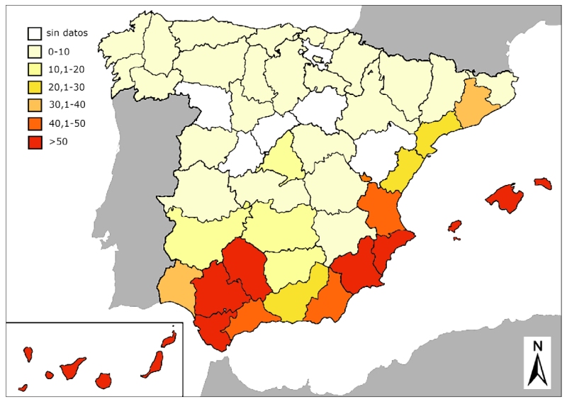 Porcentaje de municipios con presencia de Periplaneta americana por provincia / C.Pradera, E. Rodríguez-García: Distribución actual e historia de la colonización de la cucaracha americana Periplaneta americana (Linnaeus, 1758) (Blattodea, Blattidae) en España, Boln. Asoc. esp. Ent., 49 (1-2): 113-127