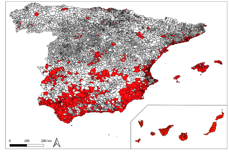 Con los datos obtenidos se ha elaborado el siguiente mapa de distribución por municipios de España: