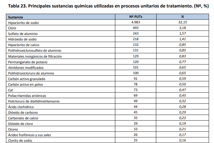 Los productos más utilizados son los desinfectantes biocidas (tipo de producto 5): los tres más usados son el Hipoclorito de sodio (32,15% de los PUT), seguido del cloro (3,2% de los PUT) y el sulfato de aluminio (1,6% de los PUTs) .