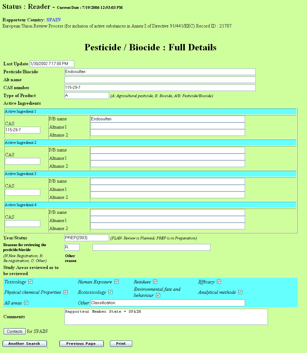 Cada uno de los informes, llamados "monographs", contiene un registro escrito de la evaluación gubernamental del riesgo de un pesticida o biocida. Aunque la base de datos no es a texto completo sino referencial, constituye una útil herramienta para identificar la documentación existente sobre un determinado producto para posteriormente poder dirigirse al organismo concreto y solicitarle una copia del documento original.